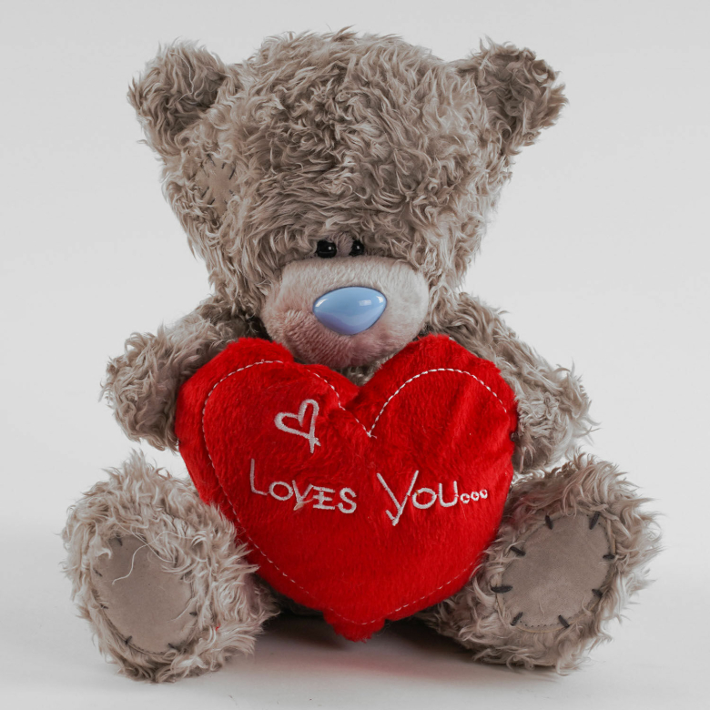 Ведмежа представлене в сидячій позі та тримає у своїх лапках м'яке, червоне серце.