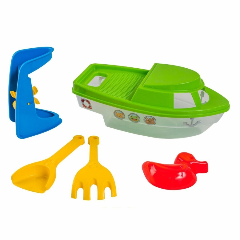Набір для піску "Кораблик" 6 ел. з млином поєднує у собі функції іграшки та пісочного набору. Кораблик виконаний у вигляді лотка, що складається із 2х частин. Кольоровий верх кораблика виконує роль сита. Малюк може його тримати за зручну ручку - отвір. Нижня прозора частина виконує роль ємності для піску, за допомогою якої можна побудувати вежу з піску, а також лотка для перенесення аксесуарів для піску. Сам кораблик чудово тримається на воді і в ньому можна перевозити не важкі вантажі.